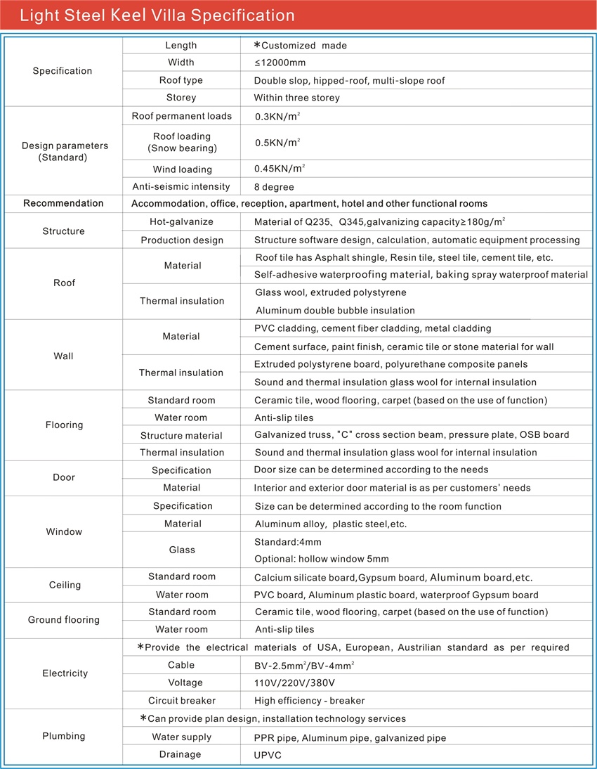 Easy installation----the mounting holes and the pipe holes of light steel villa are prefabrication, 4-5 people can complete the installation.