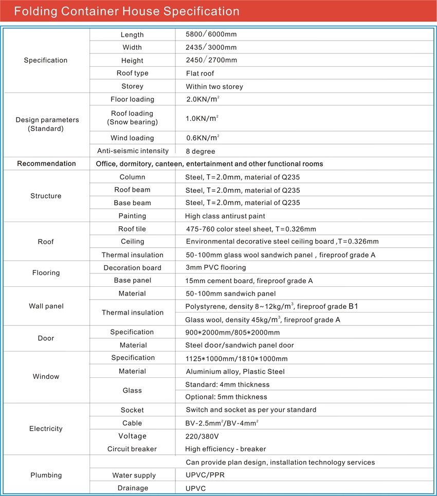 Folding container is a container house product which can be folding storage and transportation, quick and easy for assemble and disassemble, convenient for transportation. This product applicable to the construction site of temporary buildings, field exploration space, the government resettlement housing and others.